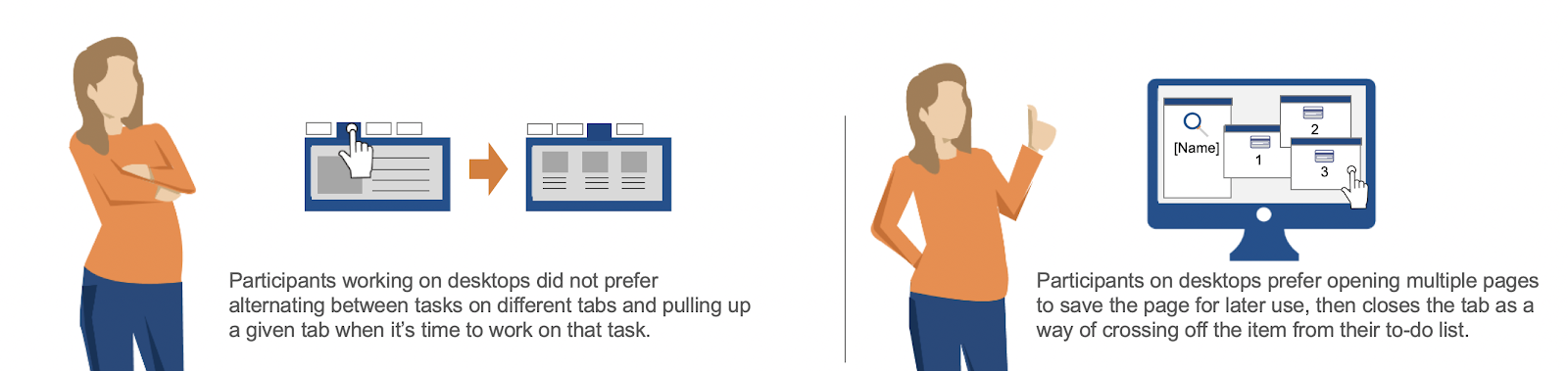 To turn your findings into an instruction manual for your stakeholders, use diagrams, mock-ups, icons, or charts as different ways of looking at the same text-only information. In this example, a simple visual shows participants’ preferences on accessing information with tabs versus separate windows on desktop. Showing these options in an illustration clearly differentiates the preferences at first glance and helps readers visualize the changes.